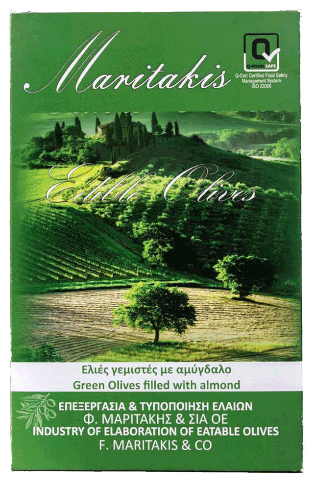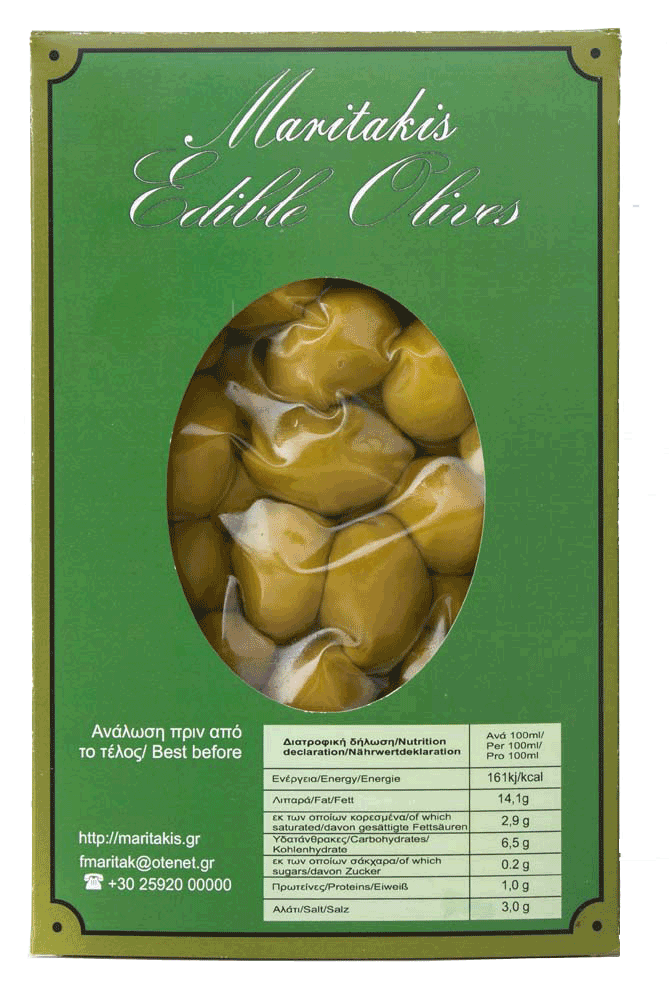Συστατικά: Ελιές, άλμη, ηλιέλαιο, αλάτι, σόδα, ρυθμιστής οξύτητας: γαλακτικό οξύ, συντηρητικό: σορβικό οξύ, μέσο οξίνισης: κιτρικό οξύ, αντιοξειδωτικό: ασκορβικό οξύ.