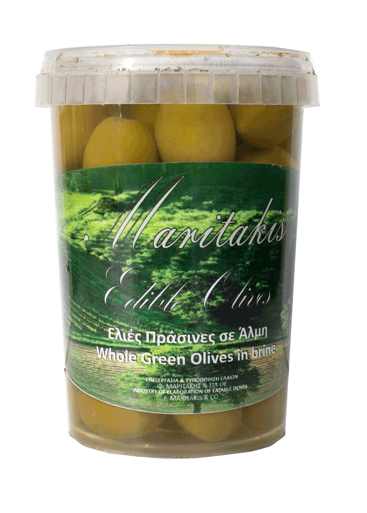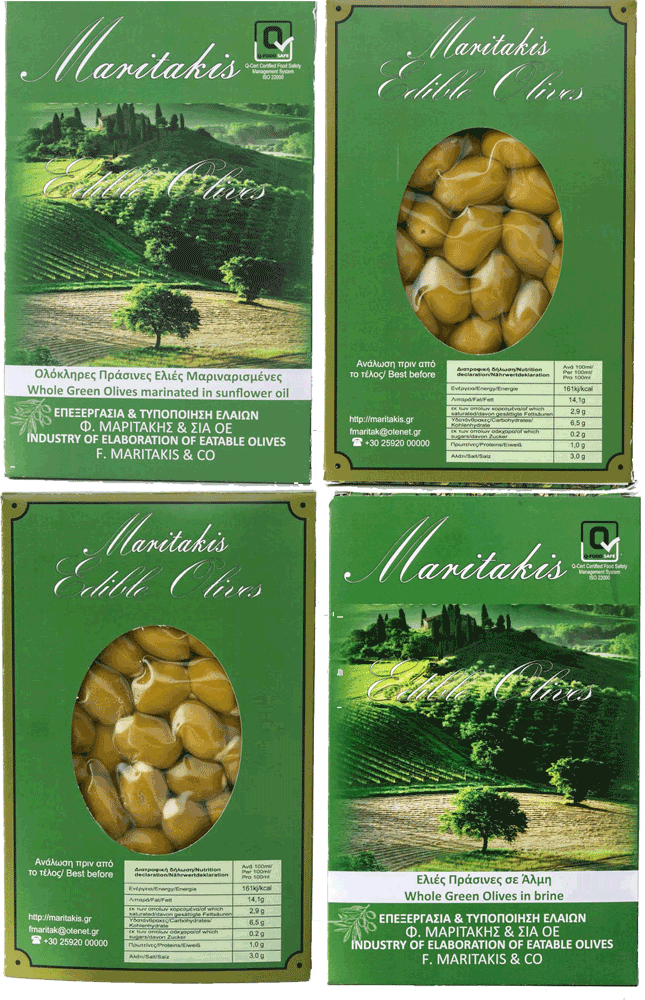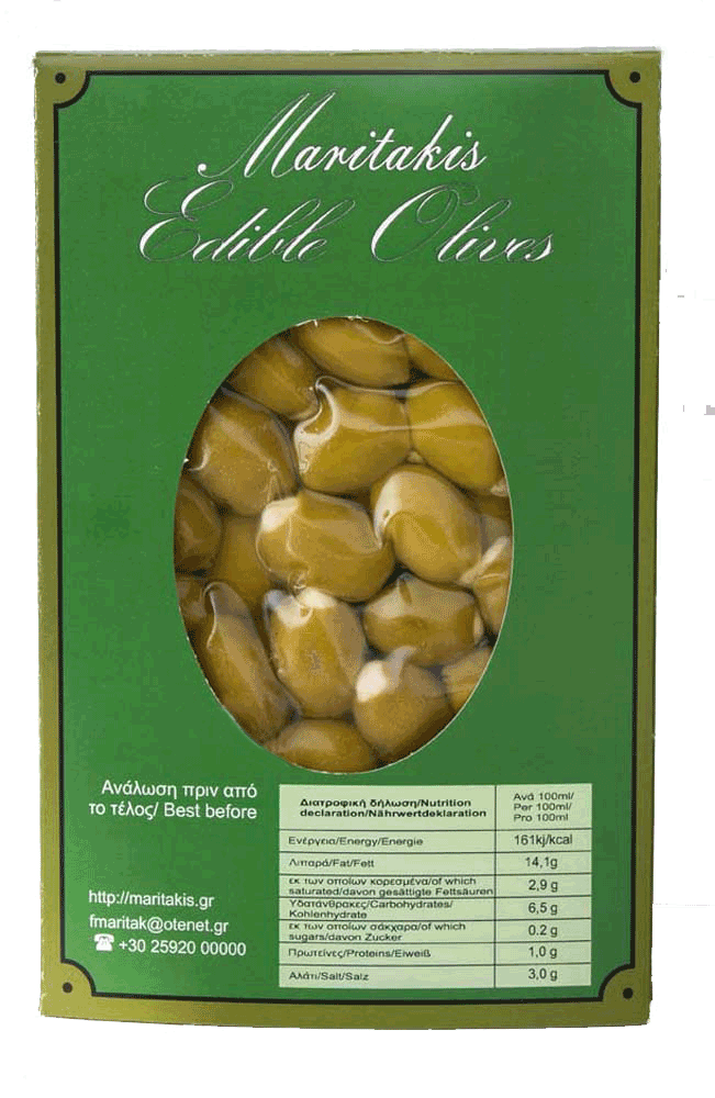 Συστατικά: Ελιές, άλμη, ηλιέλαιο, αλάτι, σόδα, ρυθμιστής οξύτητας: γαλακτικό οξύ, συντηρητικό: σορβικό οξύ, μέσο οξίνισης: κιτρικό οξύ, αντιοξειδωτικό: ασκορβικό οξύ.