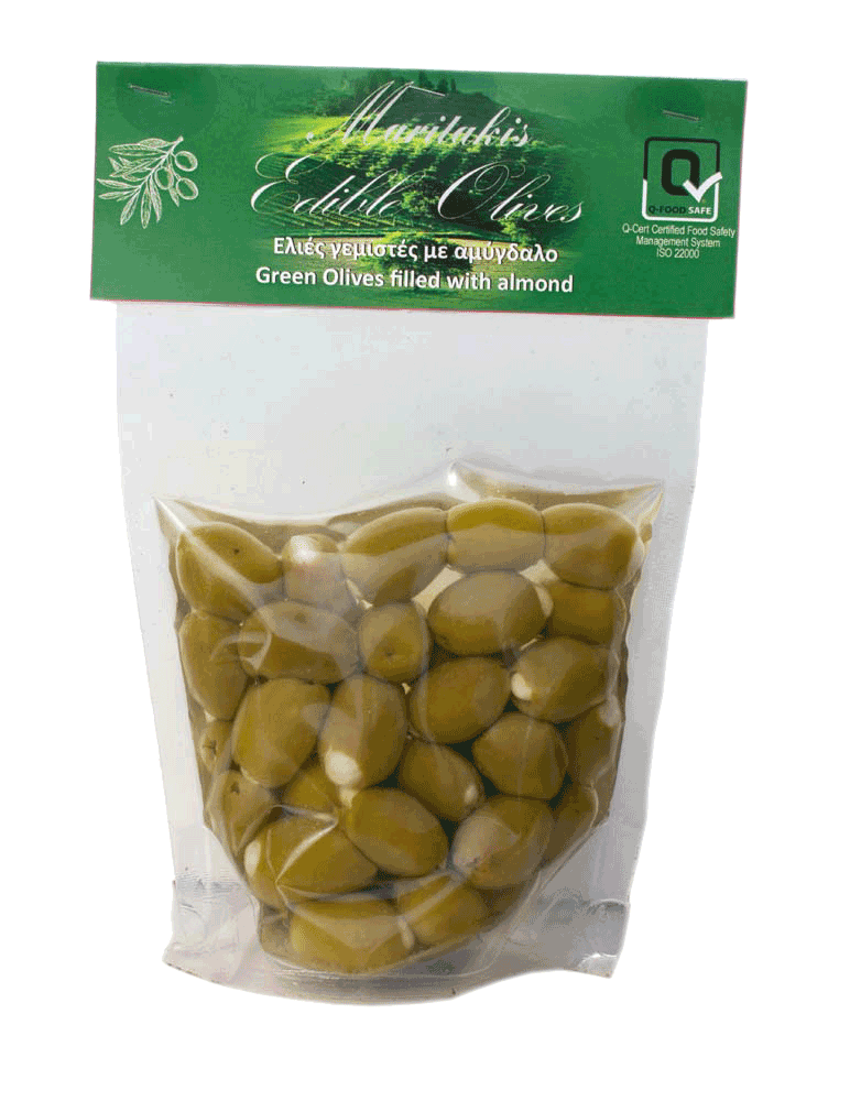 grflagΣυστατικά: Ελιές, άλμη, ηλιέλαιο, αλάτι, σόδα, ρυθμιστής οξύτητας: γαλακτικό οξύ, συντηρητικό: σορβικό οξύ, μέσο οξίνισης: κιτρικό οξύ, αντιοξειδωτικό: ασκορβικό οξύ.